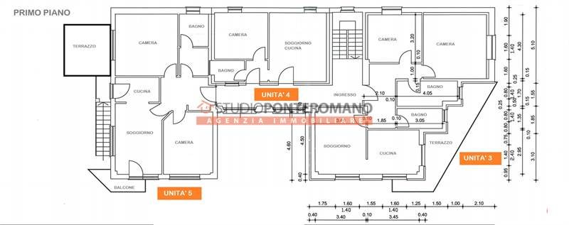 una terza unità abitativa composta da ingresso, soggiorno, cucina, due camere, bagno, balcone e terrazzo.