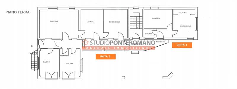 una seconda unità con camera, soggiorno, cucina, taverna, servizio e locale deposito, anch’essa da riqualificare.